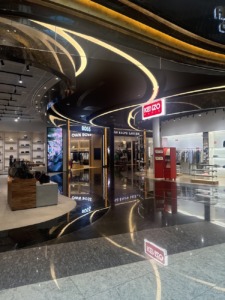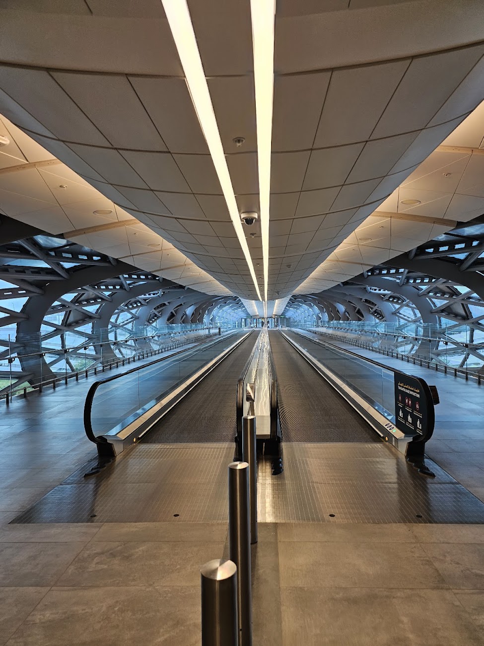 El acceso se realiza caminando desde el interior del edificio hasta la zona de paradas, organizada como una estación de superficie integrada en la red de transporte público del emirato.