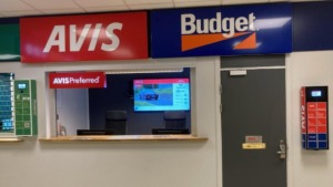 Se observan los mostradores de Avis y Budget, junto a un terminal de autoservicio de Avis, en el interior de la oficina de alquiler de autos.