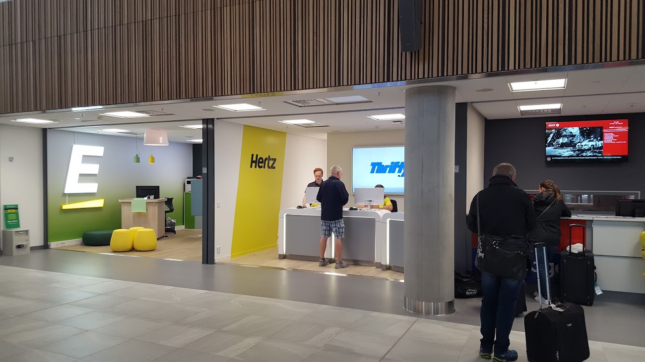 Oficinas de alquiler de Europcar, Hertz y Thrifty en el aeropuerto, con turistas esperando ser atendidos, además de un módulo de Avis.