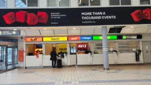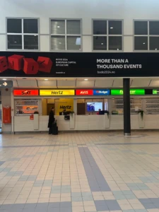 Se observan los mostradores de Sixt, Hertz, Avis, Budget, Europcar y Enterprise, ofreciendo servicios de alquiler de vehículos a los visitantes.