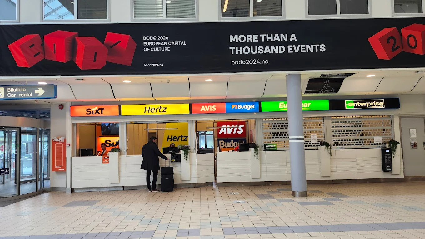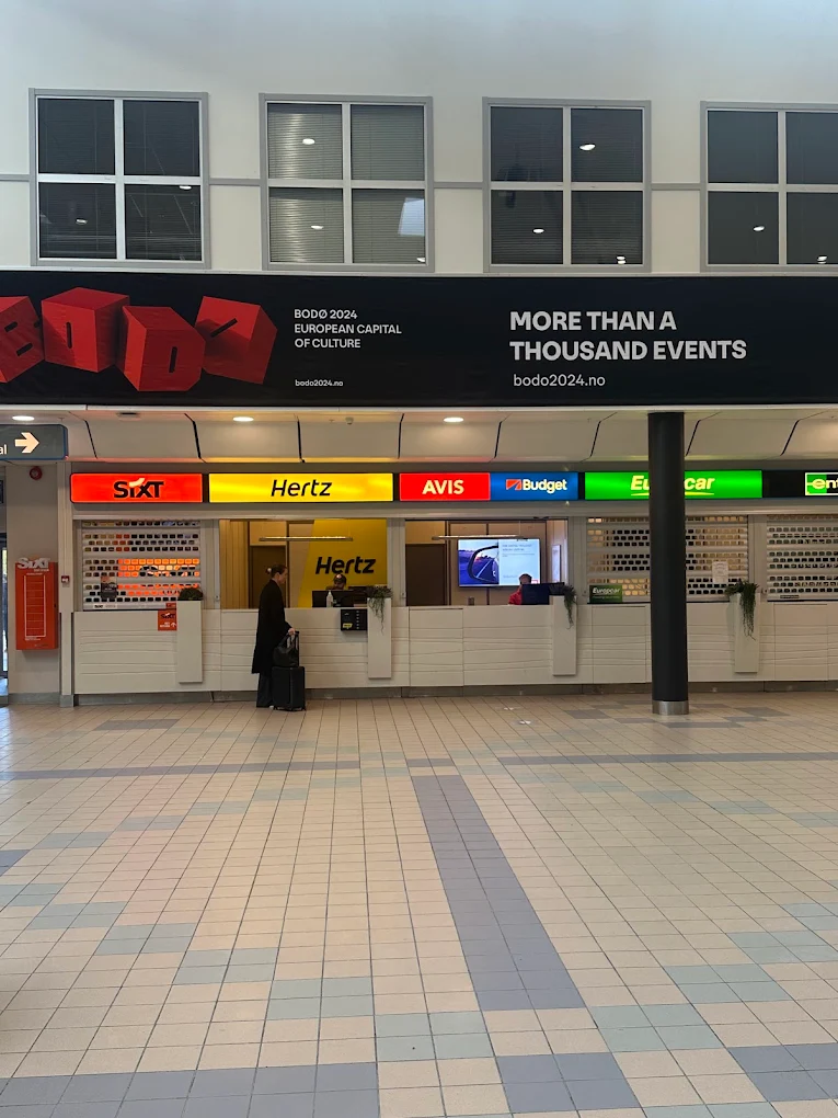 En Bodø el aeropuerto se encuentra muy próximo al centro urbano, por lo que la devolución de vehículos se realiza directamente en el recinto aeroportuario sin rutas externas complejas ni puntos de entrega remotos.