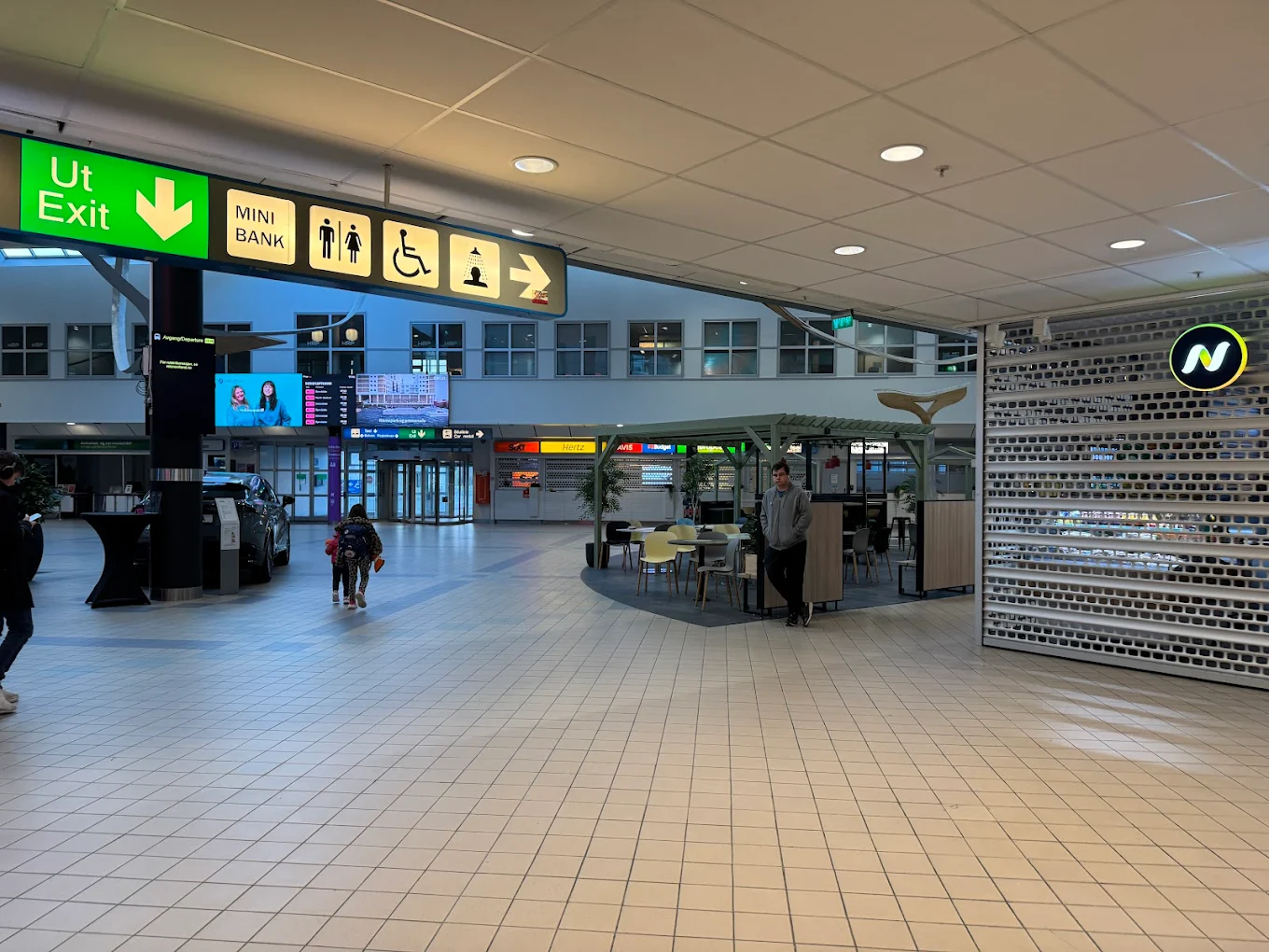 El Aeropuerto de Bodø concentra la operativa de alquiler de autos dentro del edificio terminal, con mostradores situados en la zona pública de llegadas y recogida de vehículos en áreas de estacionamiento adyacentes al terminal, accesibles a pie desde la salida principal.