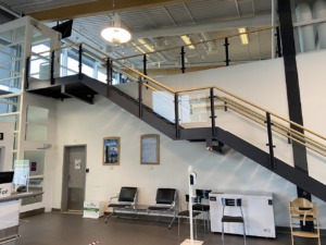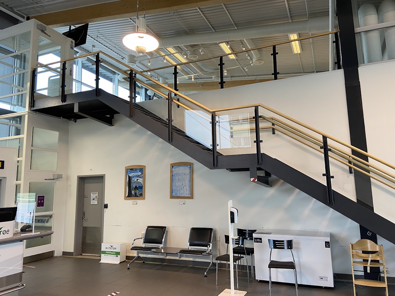 Su disposición sigue el eje principal de circulación del edificio, entre la entrada, el control y la sala de espera.