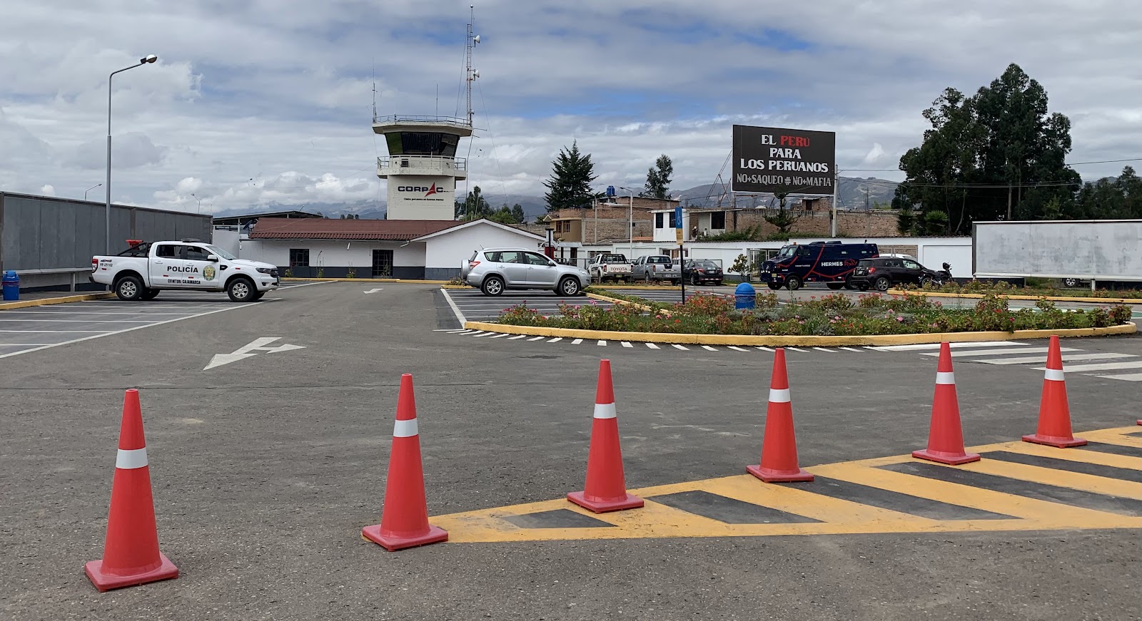 - Se observa a excursionistas caminando frente al edificio del aeropuerto, con conos de seguridad delimitando el área de tránsito, bajo un cielo nublado en Cajamarca, Perú.
