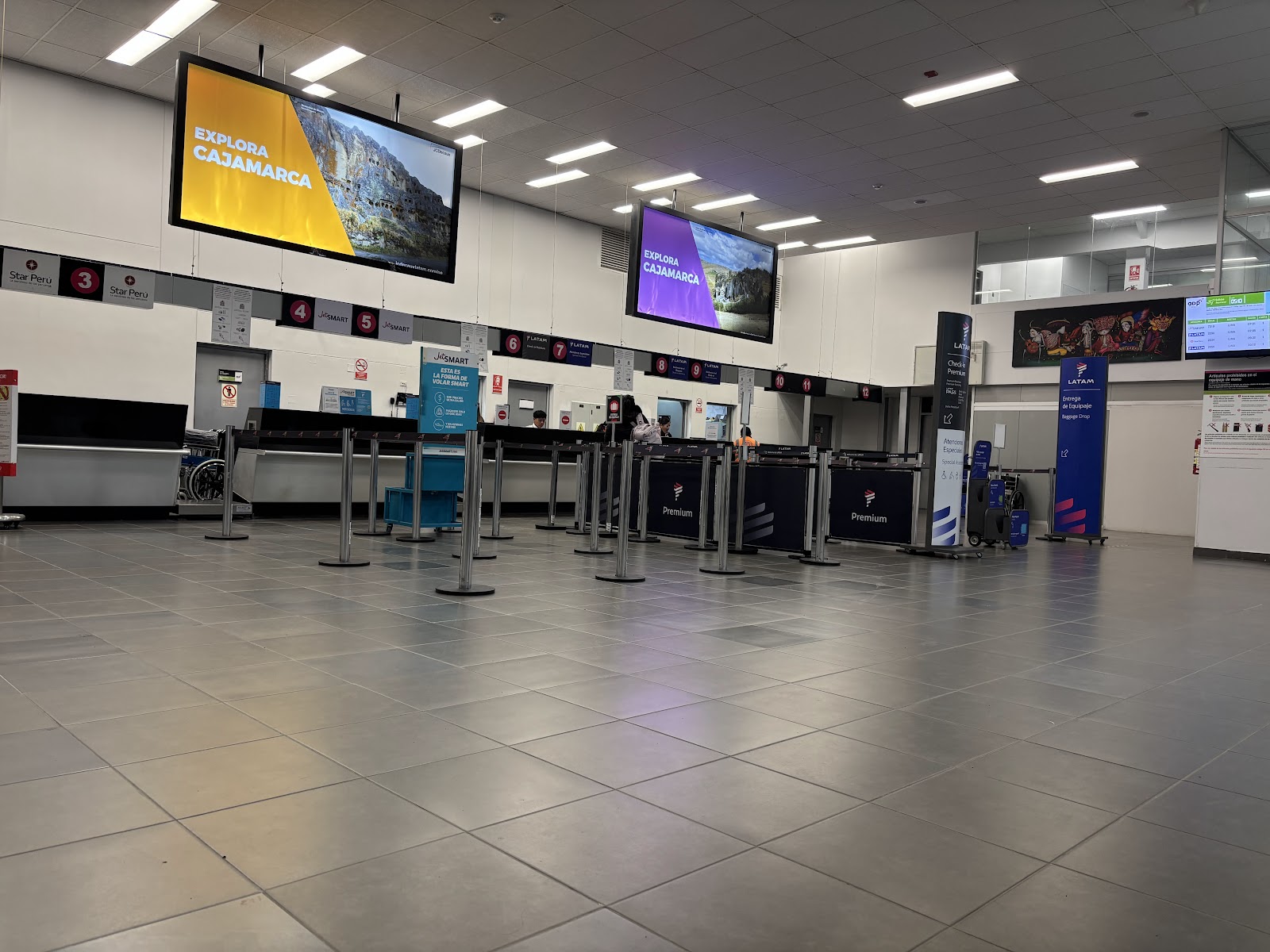 - Se observan los mostradores de check-in de varias aerolíneas, incluyendo Star Perú y LATAM, en el Aeropuerto Internacional Armando Revoredo Iglesias.