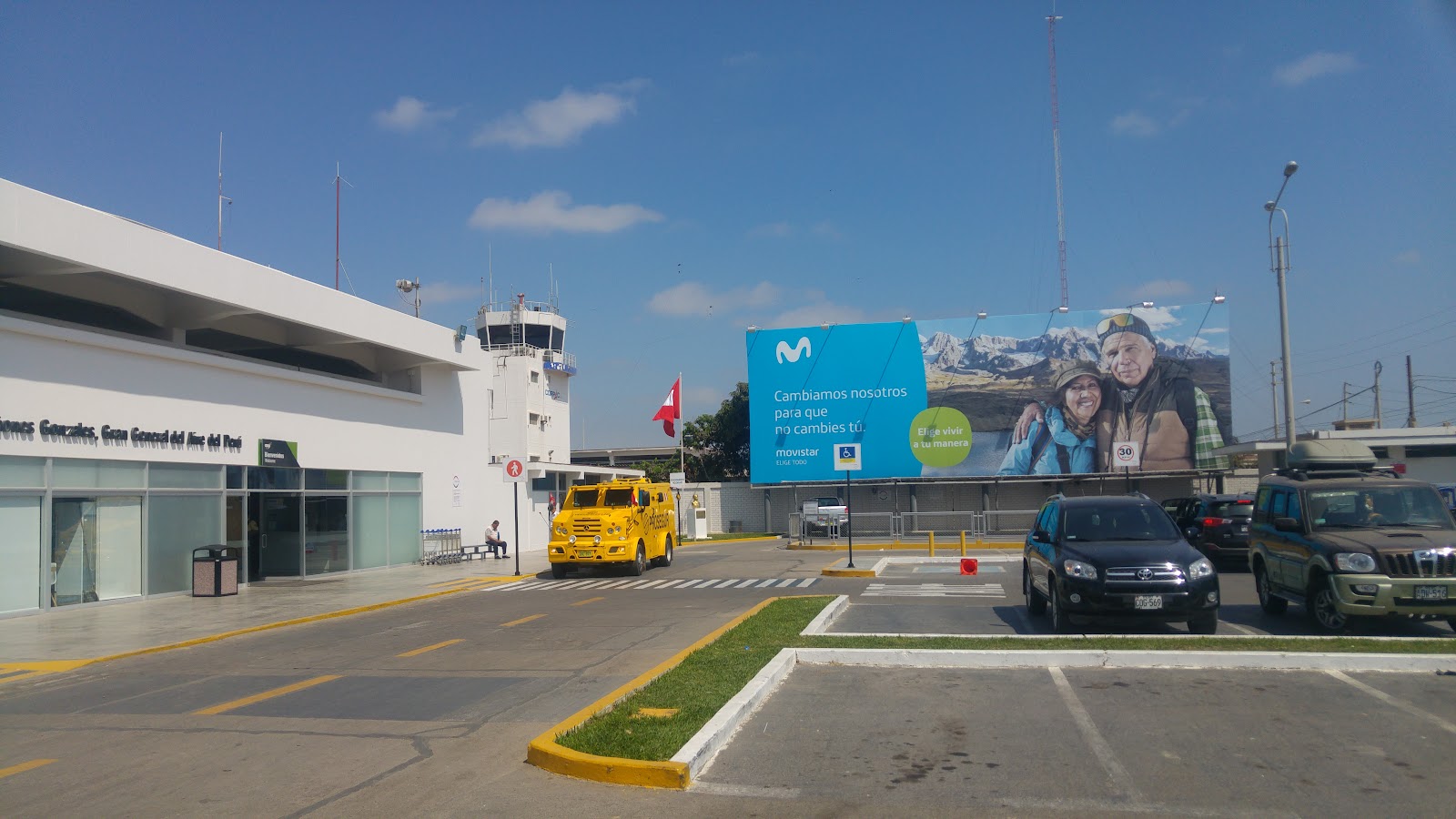 - La imagen muestra la fachada del aeropuerto, una torre de control, un vehículo de seguridad amarillo y una valla publicitaria de Movistar, todo bajo un cielo azul claro.