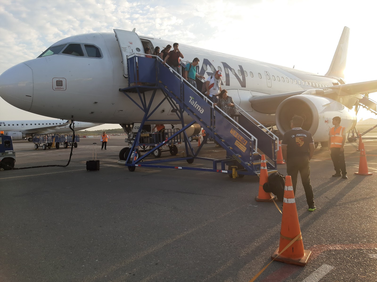- Observamos el turistas desde un avión el aeropuerto José A. Quiñones, con una escalera azul y un vehículo asistencia tierra.