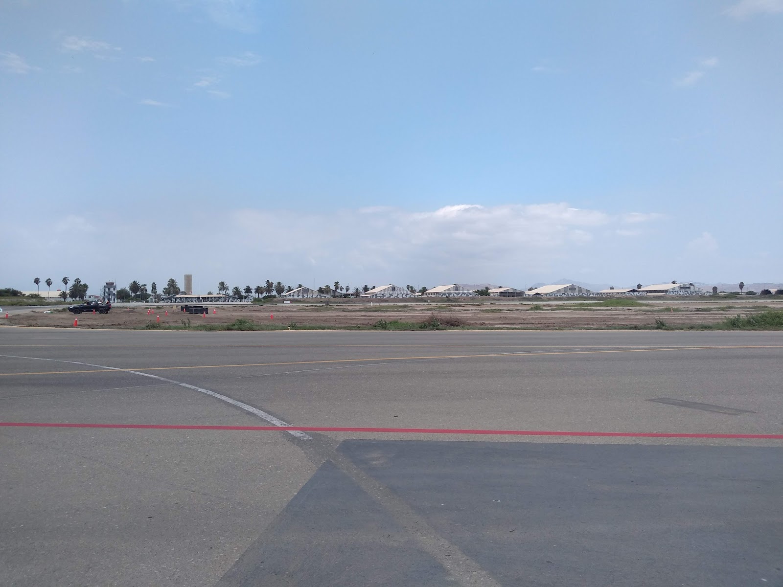 - Se observa una pista de aterrizaje en primer plano y al fondo, algunas estructuras y vegetación, bajo un cielo parcialmente nublado en el Aeropuerto Internacional de Chiclayo.