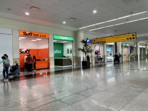 Se observan las oficinas de Sixt y Localiza, además de la señalización de llegadas y salidas nacionales e internacionales en el aeropuerto.
