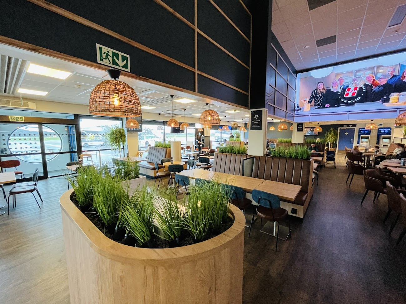 El control de seguridad da acceso a una zona de embarque compacta desde la que se accede a las aeronaves en posiciones próximas al edificio, sin sistemas de transporte interno.