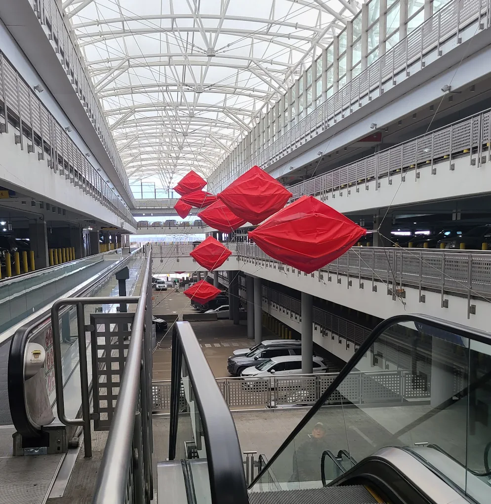 Las paradas se encuentran fuera del edificio principal, integradas en el sistema de acceso vial del aeropuerto.