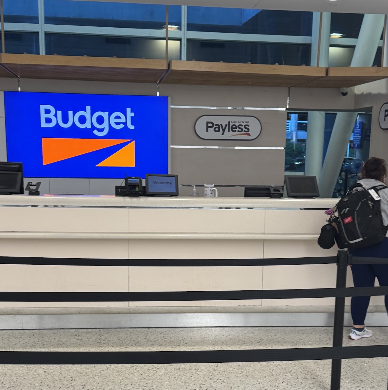 Mostrador de Budget y Payless Car Rental en un aeropuerto, con una persona esperando y señalización visible de ambas compañías de alquiler de autos.