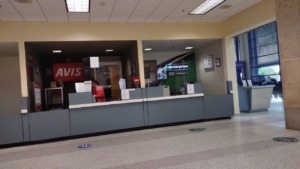 Los mostradores se encuentran en el interior de la terminal, en la zona pública próxima al área de llegadas. Desde este punto, el acceso a los vehículos se realiza saliendo al exterior hacia los estacionamientos adyacentes.