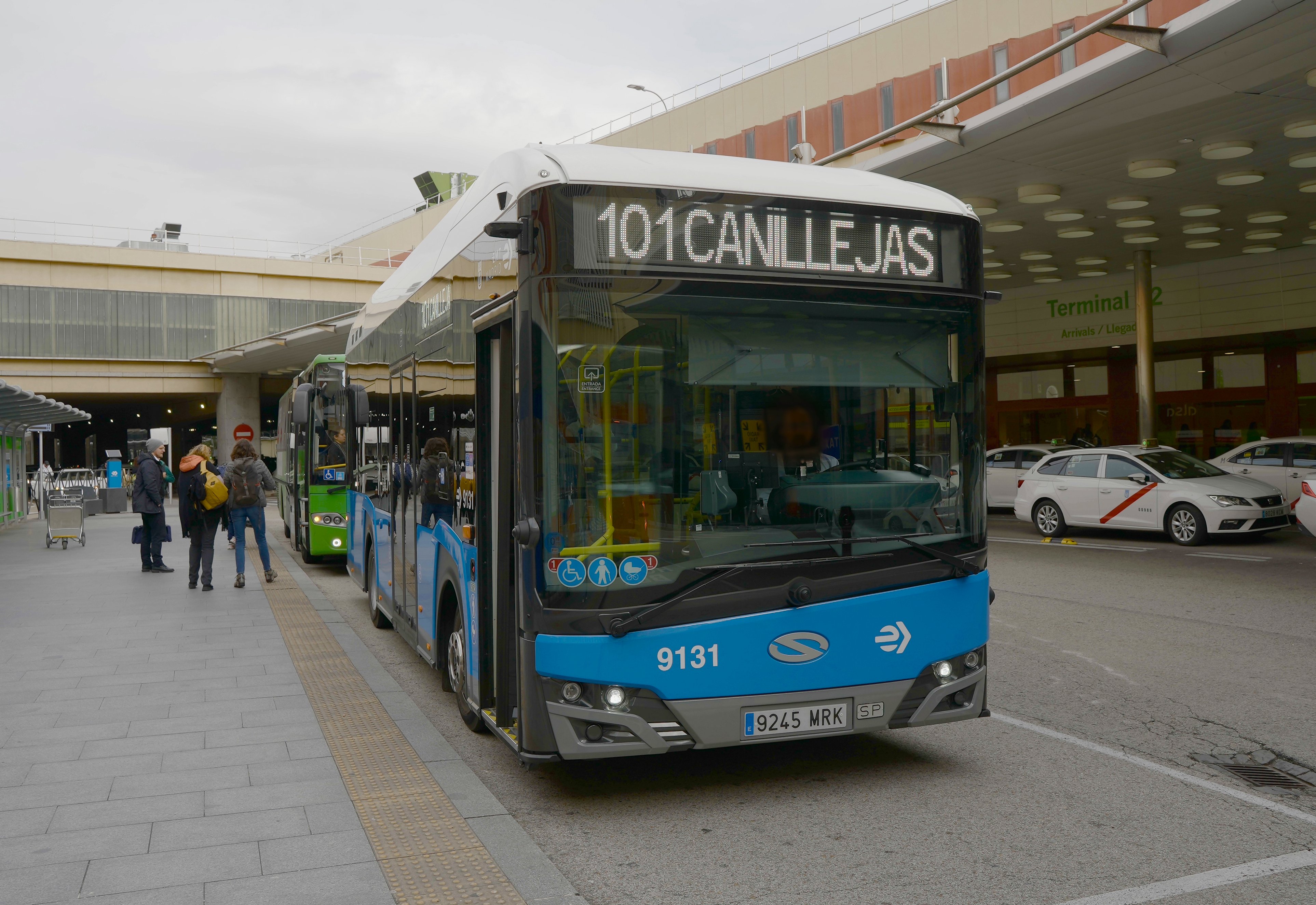 Autobús urbano de la Línea 101 de la EMT, con destino a Canillejas, en la parada de llegadas del Aeropuerto Adolfo Suárez Madrid-Barajas. Es una opción económica para enlazar con la red de Metro y autobuses urbanos de Madrid.