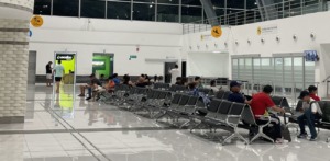 Zona de embarque con asientos en sala principal y locales de alquiler de autos al fondo, incluido un mostrador de Localiza dentro de la terminal.