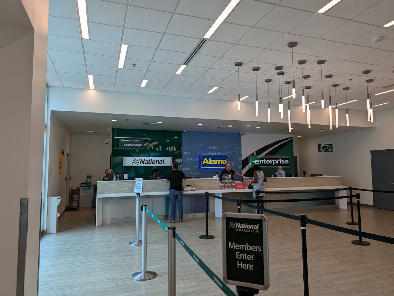 El área de mostradores de National, Alamo y Enterprise ofrece servicios de alquiler de vehículos a los visitantes