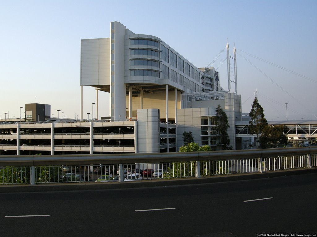 El aeropuerto se sitúa aproximadamente a 23 km del centro de Melbourne y el acceso se realiza por vía terrestre mediante taxi, autobuses, traslados y alquiler de autos, dentro de un entorno metropolitano conectado por la Tullamarine Freeway, sin conexión ferroviaria directa en el recinto aeroportuario.