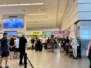 Visitantes esperan en fila frente a los mostradores de Hertz, Europcar, Avis y Budget para alquilar un auto en el aeropuerto