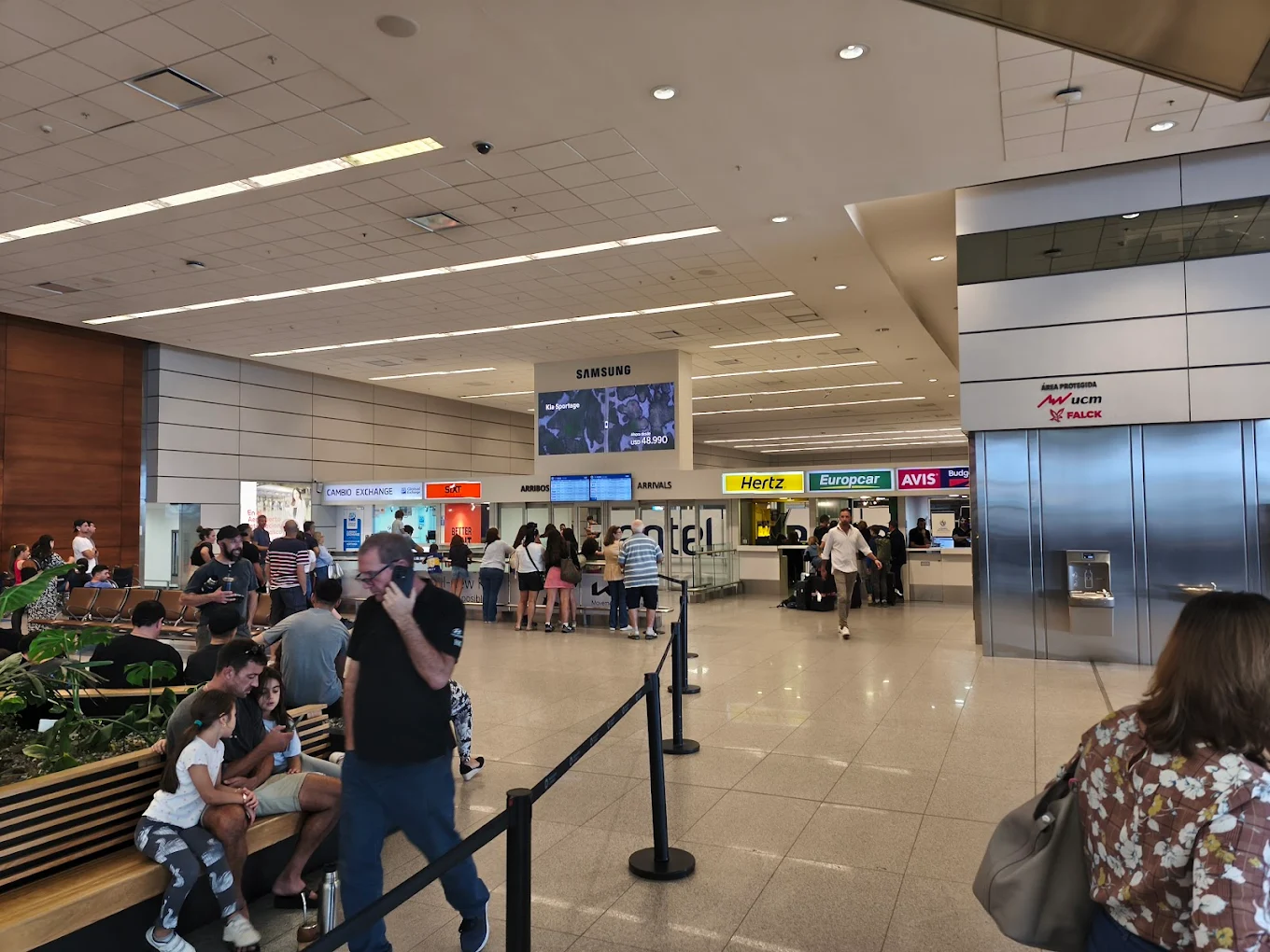 Oficinas de alquiler de autos como Hertz, Europcar y Avis, junto a servicios de cambio de divisas, esperan a los visitantes en la zona de llegadas.