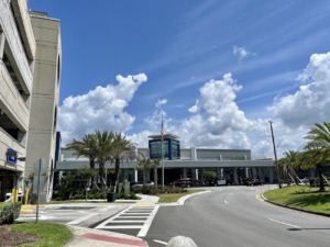 Alquiler de autos en el Aeropuerto de Orlando – Sanford – Mostradores en llegadas y recogida cruzando la vía frente a la terminal.