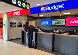 Área de mostradores de alquiler de autos Avis, Budget, Hertz y Europcar en el aeropuerto, con turistas llegando con su equipaje.