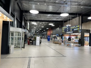 La terminal se organiza en un único edificio con áreas diferenciadas para salidas y llegadas dentro del mismo volumen. El acceso se realiza desde una explanada frontal conectada con las zonas de estacionamiento y transporte.