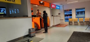 El mostrador de Sixt atiende a un visitante en el aeropuerto, mientras otros mostradores de alquiler de autos se ven al fondo.
