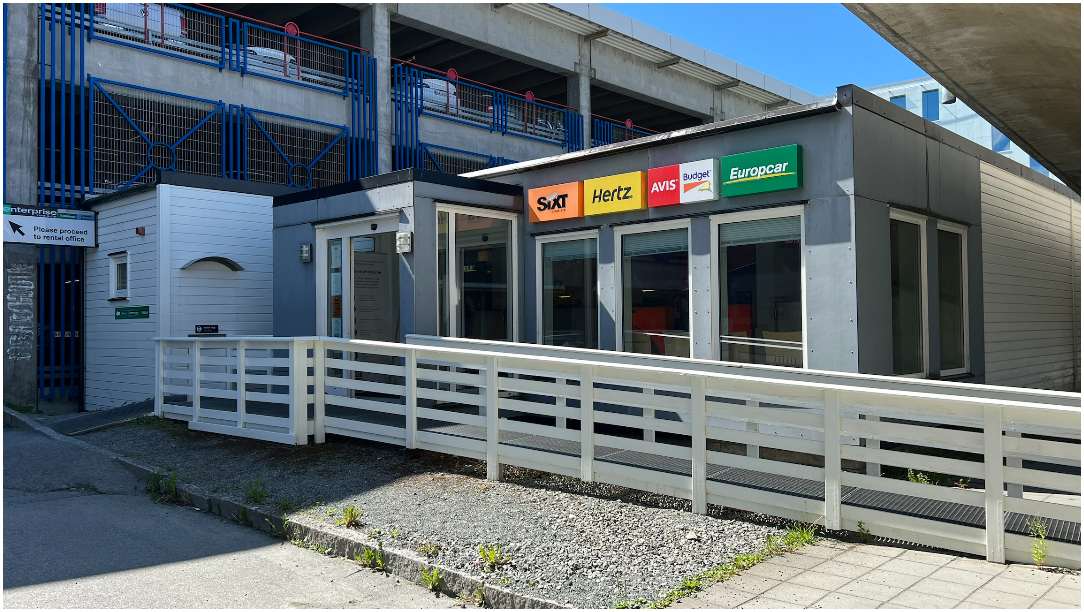 Los mostradores de alquiler de autos se encuentran en la zona pública de la terminal, agrupados en el interior del edificio. En el aeropuerto operan Avis, Budget, Enterprise, Hertz, Hyre y Sixt, según la información oficial publicada por Avinor.
