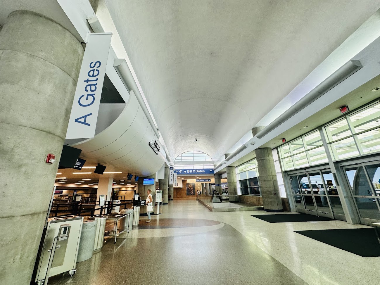 Tras el control de seguridad, el área de embarque se distribuye en dos zonas diferenciadas dentro del mismo edificio, conectadas entre sí mediante pasillos interiores y con acceso a las puertas de embarque en contacto con la plataforma.