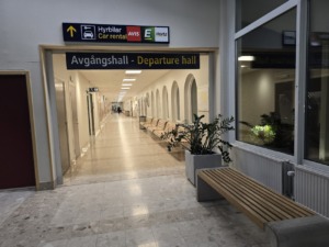 La señalización indica la dirección para el alquiler de autos (Avis, Hertz) y la sala de embarque en el aeropuerto de Visby